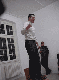 An allegory about power in five parts, with the performer positioned: on the ground under a chair, standing up while holding a chair above his head (in a proclamatory, yet self-controlled manner), next to the chair (of power or of the powerful), on the chair as a demagogic agitator? and as the synthesis of all: floating above the chair? (translated by louisa schaefer)